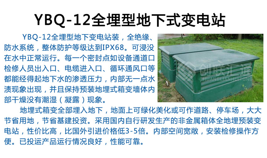 YBDM-12系列地埋箱式變電站(簡稱地埋式箱變),是在充分研究和探討現代城市建設和管理的基礎上,新開發出的新一代箱式變。其主體部分或全部埋入地下,占地很少,甚至不占地,視覺效果非常好,有效解決了城市用地緊張和城市牛皮癬的矛盾,與周邊環境和諧統一,備受廣大專家和用戶的推崇。地埋箱式變電站是指該箱式變電站的成套裝置全部安裝于一個全密封的箱體內部并把整體設制于地平面以下,它和地面上箱式變電站,內部設備是相同的,同樣是由10KV輸入電壓經變壓器降為400/220V配電電壓再送配至使用負荷點,可用于環網配電系統,也可作為放射式電網終端供電的變電站。這種全地埋型又稱地下變電站,它的箱體具有極好的防腐能力和抗壓能力,并具有絕對的密封性。